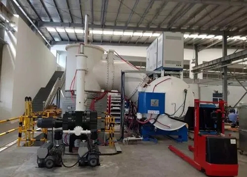 真空淬火爐是由爐體、爐體鋼支架、可拆式爐頂、爐襯、電熱元件、循環風機、導風板、爐底對開式爐門、倍速升降機構、料架、淬火槽、運料車、控制系統及配電柜/控制柜、液壓系統等組成。爐體外殼框架采用型鋼焊接成型,內壁采用耐熱鋼板,內襯采用優質全纖維結構,爐殼內表面貼附一層橡膠石棉板,起到隔熱作用并保護爐殼表面不被腐蝕。